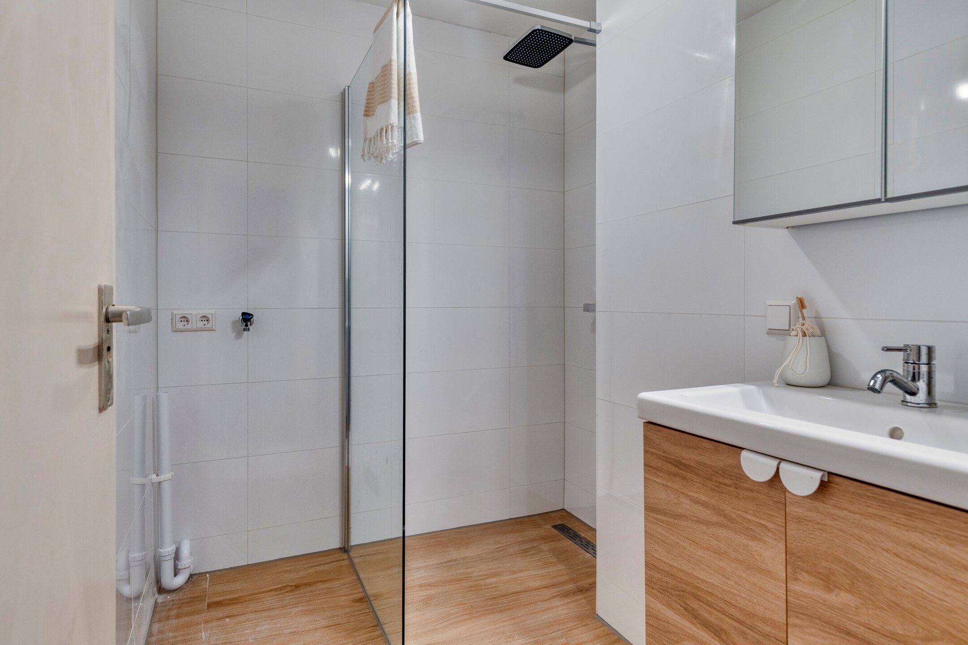 Aan de linkerzijde ligt de lichte woonkamer met een charmant groot raam en een halfopen keuken, die in 2025 volledig is vernieuwd en voorzien van moderne inbouwapparatuur. De nieuwe badkamer (2025) is compact maar stijlvol afgewerkt, met een inloopdouche, wastafelmeubel en wasmachineaansluiting. Daarnaast is er een apart toilet met cv-opstelling. Op de zolderverdieping bevindt zich een ruime berging (13 m²) – ideaal als opslag- of hobbyruimte.